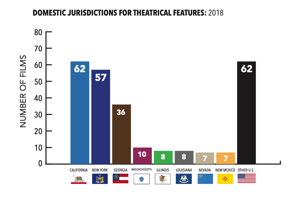 An analysis of all filming locations for the 56 original movies released by streaming services in 2018 revealed that New York (13 films), California (11), Canada (10), the UK (6) and Georgia (3) were the primary destinations.